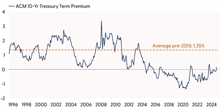 So, how does this affect fixed income investors? A positive term premium could keep longer-term interest rates elevated, perhaps reducing the diversification benefits of core bonds. Regarding the former, while monetary policy expectations will continue to be the dominant driver of interest rate changes, Fed rate cuts may not have the desired effect, and longer-term interest rates may not fall as much as they would have without a positive term premium (like we’ve seen recently). In terms of the latter, while we still believe Treasury securities will be the safe-haven choice in the case of a broad macro equity market sell-off, they may not be the best defensive option for garden-variety equity market sell-offs.