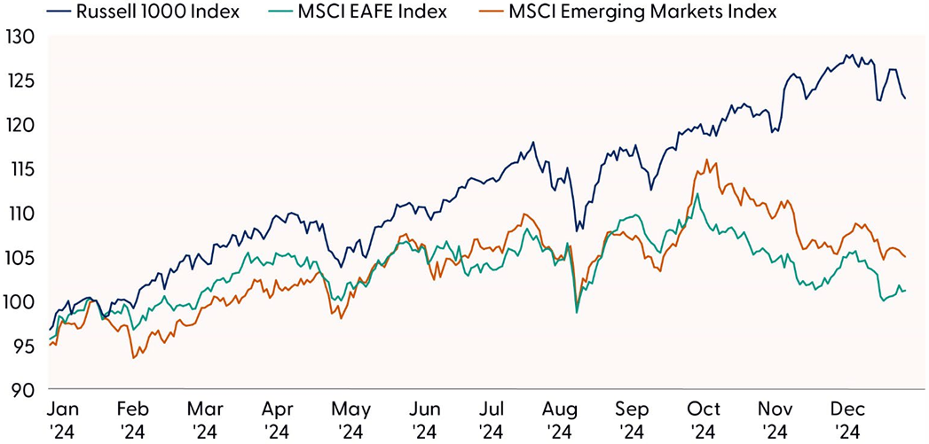 U.S. equities soundly outpaced primary international and EM benchmarks in 2024