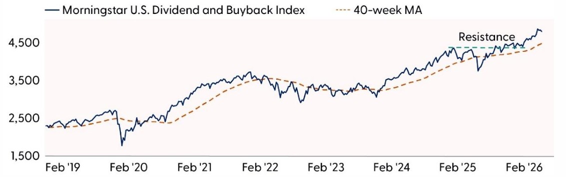 Morningstar U.S. Dividend and Buyback Index (shareholder yield): The index has continued to set new record highs after breaking out from a year-long base last fall. Recent overbought conditions have normalized as prices pulled back to test uptrend support. Participation has been robust, with 75% of constituents now trading above their 200-day moving average, a 25% improvement since November. Based on the prior consolidation range, a minimum technical upside objective sets up near 5,400, implying roughly 12% of potential upside from current levels. On a relative basis, the Morningstar U.S. Dividend and Buyback Index has reversed its downtrend versus the Morningstar U.S. Market Index and is now at multi-month highs, indicating further potential for outperformance.