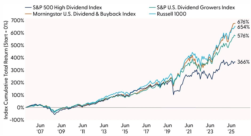 Looking ahead, the historical results make clear that simple dividend screens may not be adequate for today’s market environment. As capital allocation practices evolve and corporate balance sheets continue to diverge in quality, the opportunity set for equity income investors will increasingly support looking to approaches that go beyond headline dividend yields. A continued shift toward strategies that balance income with capital appreciation (dividend growth), total shareholder return (shareholder yield), and balance‑sheet strength (quality integration) will be essential for generating more resilient outcomes over time.