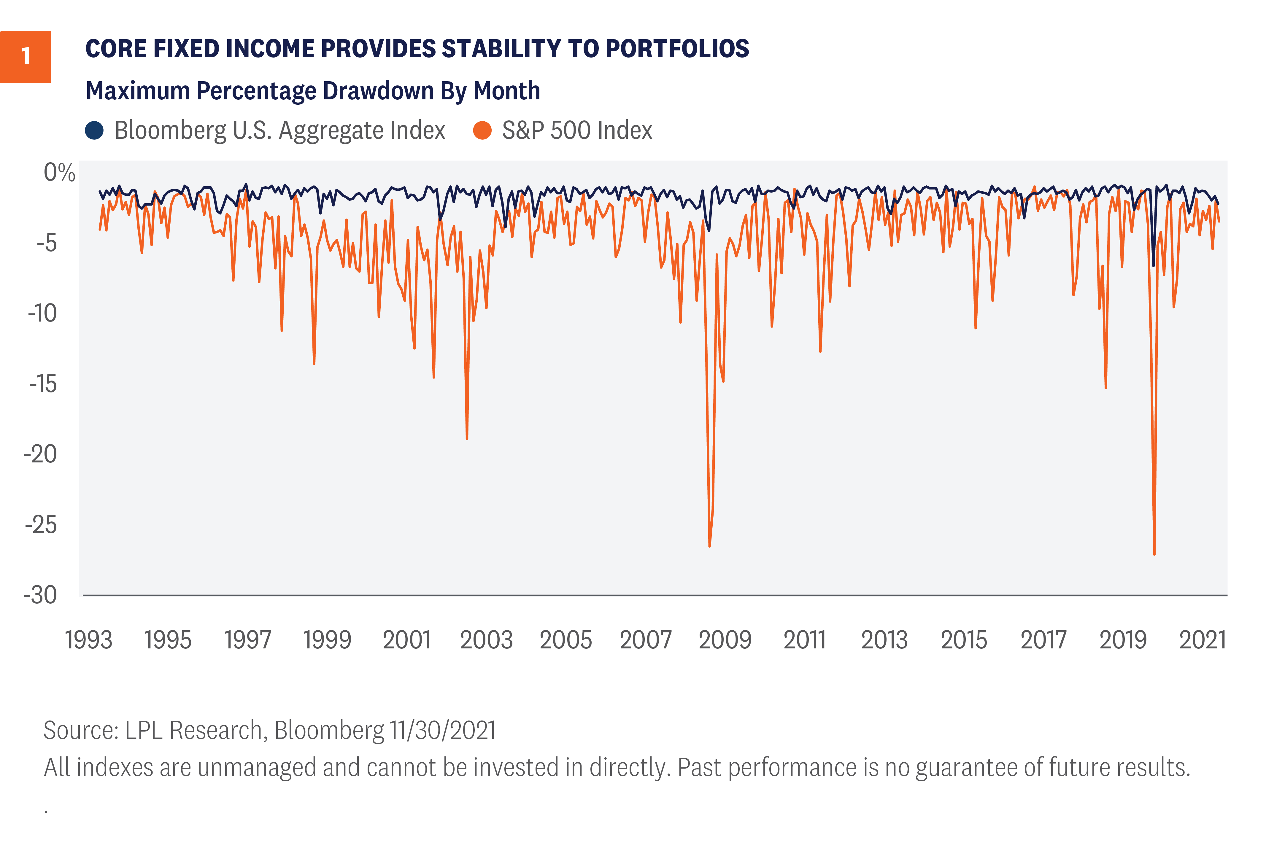 Bonds, particularly core bonds, have been less volatile than stocks and have historically provided ballast to portfolios during equity market drawdowns, which as we know, are normal occurrences from time to time. The maximum drawdown for bonds, in any given month, has been dramatically less severe than stocks [Figure 1]. While the worst drawdown in a month for equities was -28%, the worst bonds have done during a month was down 6%, and those losses were quickly reversed. So, when combined with equities, bonds help reduce total portfolio volatility, which makes for a smoother investment experience for investors.