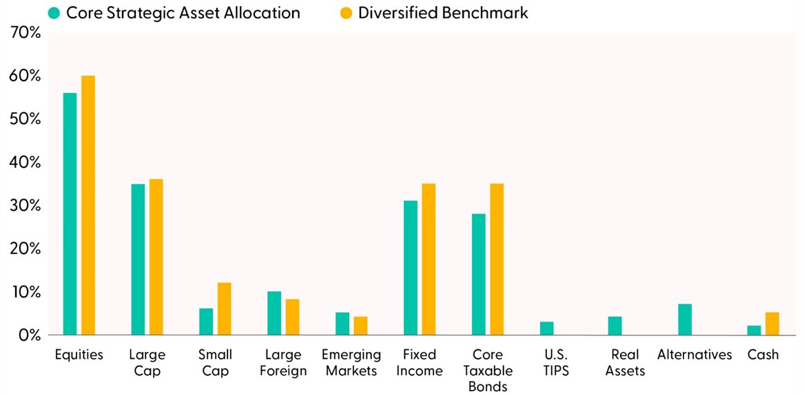 Within the 2026 SAA, we retain meaningful equity exposure but keep it modestly below benchmark exposure levels. We increase U.S. large-value and developed international equities where starting valuations, income, and stability characteristics strengthen the long-run strategic investment case. We trim small cap equities to balance return potential with volatility, acknowledging a tighter risk-reward today, but we still believe in their role over full market cycles and keep a material overweight relative to a purely global market cap baseline. Reducing small caps modestly allows the portfolio to benefit from their long-term potential while avoiding excess volatility during periods when quality and income characteristics in larger-cap markets seem more compelling. The result in this vintage of the SAA is a steadier mix of equities that relies less on a narrow set of increasingly concentrated outcomes and more on diversified drivers of return.