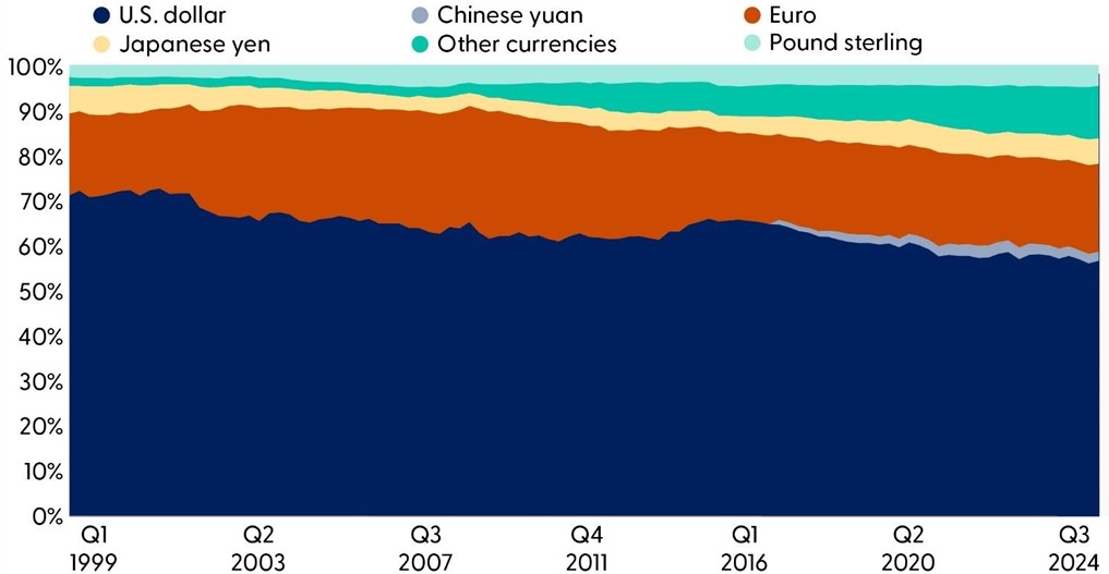 The U.S. dollar remains the world’s primary reserve currency, reinforcing demand for American assets. Since the Bretton Woods Agreement of 1944, the dollar has been the primary currency for global trade and financial transactions, with roughly 60% of global foreign exchange reserves currently held in USD. This dominance allows the U.S. to borrow at lower interest rates and maintain economic influence worldwide. However, recent trends indicate a gradual diversification among central banks, with increasing allocations to nontraditional reserve currencies, such as the Chinese yuan, Canadian dollar, and gold. With diversification comes risks, especially liquidity risks. The USD market is quite deep, giving global investors comfort that there will always be others willing to take the other side of a trade. While the dollar remains the most trusted currency, geopolitical shifts and economic fragmentation continue to challenge its supremacy.