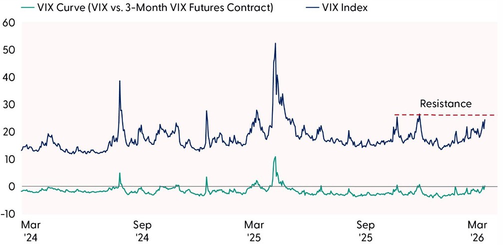 Because volatility tends to revert to its long-term average, the VIX is most useful at its extremes. Low readings can indicate investor complacency, while high readings may suggest markets are nearing peak fear. The recent jump in implied volatility has pushed the VIX to its highest point since last fall. A decisive move above the November closing high at 26.42 would imply additional upside risk in the fear gauge. Conversely, a failure to break above that level, particularly if it occurs alongside a shift back to a normal, upward-sloping VIX futures curve, could indicate that fear is topping out. At present, the futures curve is in backwardation, with near-term contracts priced above longer dated ones, a rare pattern typically associated with acute market stress. A return to contango, the normal shape of the curve in which longer-term futures trade at a premium to near-term contracts, would suggest that peak fear may have been reached. Plus, the volatility of the VIX does not reflect elevated longer-term fear, which we take as an encouraging sign that the market is confident that this conflict will be over in relatively short order and that lasting damage to global energy infrastructure will be limited.