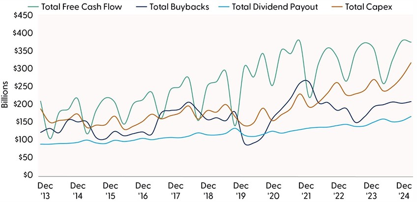 Rising free cash flows among S&P 500 companies should continue to support buybacks this year. However, companies have been spending an increasing amount of their excess cash on capital expenditures (capex). As illustrated in the “S&P 500 Corporate Cash Spending” chart, total buybacks have not kept up with the rise in free cash flows as companies have significantly ramped up capex spending over the last year. A big chunk of that capex spend is being allocated to artificial intelligence (AI) projects, including data center buildouts, processor upgrades, and expanding cloud services. Four of the big hyperscalers alone (AMZN, GOOG/L, META, MSFT) are projected to collectively spend around $333 billion on AI this year, marking a potential 35% increase from last year.