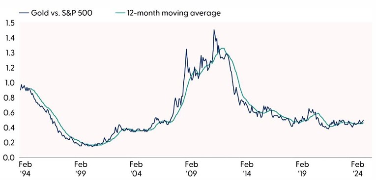 On a relative basis, when we step back and compare gold to the S&P 500 over the last 30 years, bullion still appears cheap to the broader market. This ratio chart — used to define relative trend strength and direction — has started to form a potential bottom and is back above a rising 12-month moving average. While we are not advocating investors rotate from equity markets to gold, we do reiterate our positive view on precious metals, a view we have held since last spring.